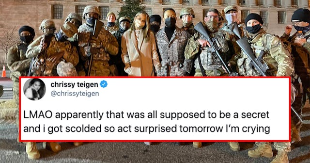 Teigen also roamed around and took photos with the National Guard like an Inauguration Day tourist, and never change, Chrissy.