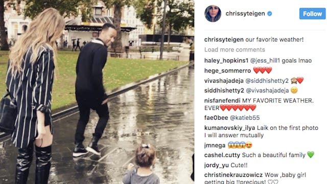 Teigen captioned the snap “Our favorite weather,” and though we tend to prefer sunshine while out and about with whiny kids who don’t like getting wet, this happy family in their chic shades of black and gray has us understanding where she’s coming from.