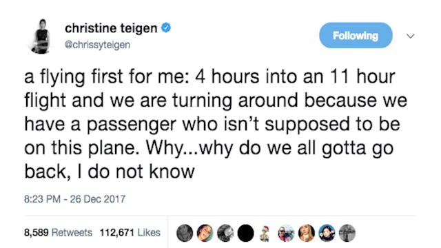 Teigen and her husband, John Legend, were en route to Tokyo to spend New Year’s Eve “eating sushi” — or so they thought. Turns out merely four hours into the 11 hour flight, the plane had to do a literal U-turn in the middle of the Pacific Ocean.