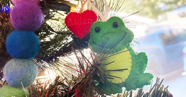 There is one with golden glitter wings whose arms and legs hang from its body like a puppet. One is wearing a tuxedo and holding a top hat. There is one made out of green fabric and a walnut shell. Only one sits like an actual frog. Toward the top of the tree hangs a frog with a happy face made of green felt. It has a red heart with the name Aiden spelled out in white letters. This is the second time we’ve set up the tree since our son died. He was 20 months old.