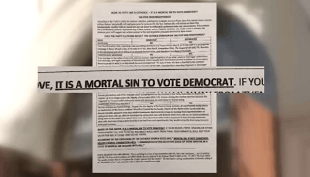 On October 16th, a flier was inserted into the weekly bulletin titled, “Voter’s Guide for Serious Catholics.” In it, parishioners of the church (which also serves as an election day polling site) were informed that the policy positions of Democrats on abortion, same-sex marriage, euthanasia, human cloning, and embryonic stem cell research run counter to Catholicism and therefore voting for Democrats would sentence church-goers to eternal damnation. “It is a mortal sin to vote Democrat,” said the flier, “…immediately after death the souls of those who die in a state of mortal sin descend into hell.”
