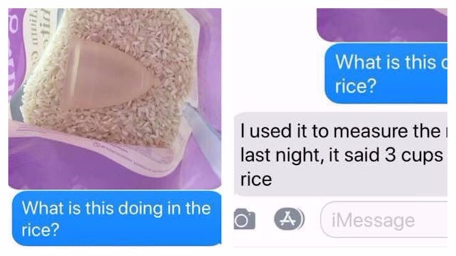 Cindy tells Scary Mommy earlier that same day, her toddler got ahold of her menstrual cup and brought it into the kitchen. Being a mom of three, Cindy got distracted after wrangling it from her and left it in the kitchen by accident. She went about her day, the cup stayed in the kitchen, and poof! Perfect rice scooper! Or so her husband thought when he took over in the kitchen later.