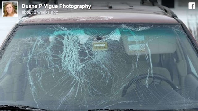 This tragedy was referenced in a recent Facebook post from the photographer Duane P. Vigue, whose wife was driving with their son when they were struck by falling ice from a nearby car. Thankfully, Vigue’s wife and son were safe, but the damage that was done to their car from the falling ice is staggering, and really makes you understand just how serious a matter this can be.