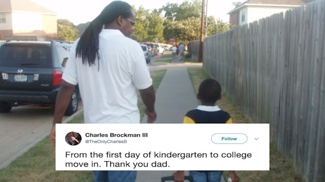That’s Charles and his father, then and now. As the teen writes, “From the first day of kindergarten to college move in. Thank you dad.”