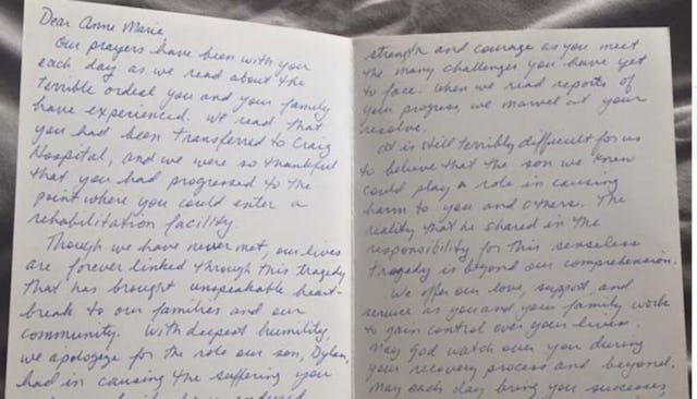 She confesses that she’s held on to a letter Klebold wrote her after the shooting, and posts a picture of it. All these years, she’s held on to that mother’s forgiveness. She didn’t have to reach out to her. She didn’t have to attempt to absolve her of any guilt she’s been carrying. But she did.