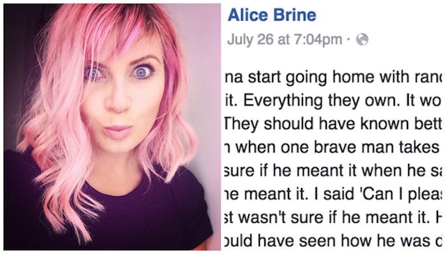 “I’m gunna [sic] start going home with random, very drunk guys and stealing all of their shit,” comedian Alice Brine wrote as a clap-back to people who who say victims who drink are asking to be assaulted. “Everything they own. It won’t be my fault though… they were drunk. They should have known better.”