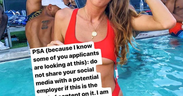 “PSA (because I know some of you applicants are looking at this),” they wrote over her photo. “Do not share your social media with a potential employer if this is the kind of content on it. I am looking for a professional marketer–not a bikini model.” The other quote read, “Go on with your bad self and do whatever in private. But this is not doing you any favors in finding a professional job.”