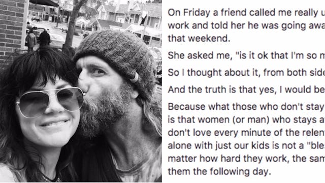 “The only break they get, their weekend so to speak, is you,” she writes. “You are the weekend, you are the break. Just knowing that you’re not going to be the only one getting food down the kids throats or not the only one to buckle in and buckle out every kids. Makes is so much easier.”
