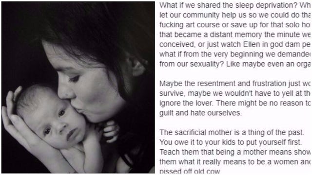 Hall continues, “What if we shared the sleep deprivation? What if we let our community help us so we could do that fucking art course or save up for that solo holiday that became a distant memory the minute we conceived, or just watch Ellen in goddamn peace, what if from the very beginning we demanded more from our sexuality? Like maybe even an orgasm…”