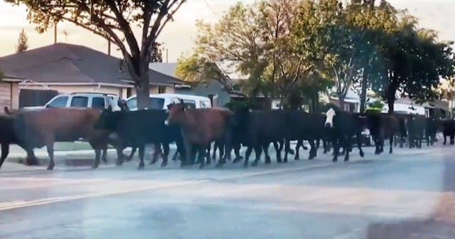 “Nearly three dozen cows broke free from a meatpacking plant and stampeded through a neighborhood about 10 miles southeast of downtown Los Angeles,” a tweet from the Today Show reads alongside footage of the wild cow caper, showing cows making their way through a suburban California neighborhood.