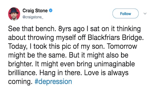 Craig Stone is a successful author with three books under his belt, a writer for Guardian, and the father to a precious little boy. But eight years ago he was on Blackfriars Bridge in London, contemplating suicide.