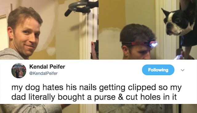 “My dog hates his nails getting clipped so my dad literally bought a purse and cut holes in it,” Peifer tweeted. She tells BuzzFeed News that her doggie’s name is Oliver, and he’s a rescue the family adopted about a year ago. Patrick was trying to find a way to keep the wiggly little guy in one place during nail clipping sessions. “It’s very difficult to keep him still while clipping nails,” she says.