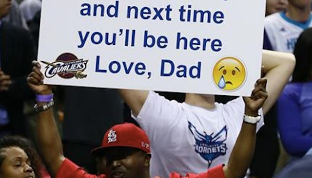 If you’re wondering if Thomas saw the sign, we can’t be sure, but odds are pretty good. Because even if he wasn’t watching the game on TV that night, the image has been making the rounds online after it was posted on Reddit with the title “Dad of the year candidate at the Cavs vs. Hornets game.”