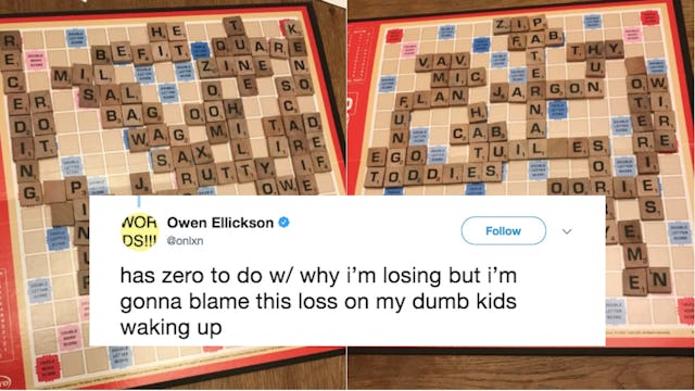 It takes a lot of guts to post this kind of humiliation on the internet for all to see. Owen Ellickson, a dad from Los Angeles, has a holiday tradition: He plays his dad at Scrabble and loses absolutely spectacularly every time. And Ellickson live tweets the whole experience so we can all laugh along as he gets utterly destroyed by his dad over and over and over.