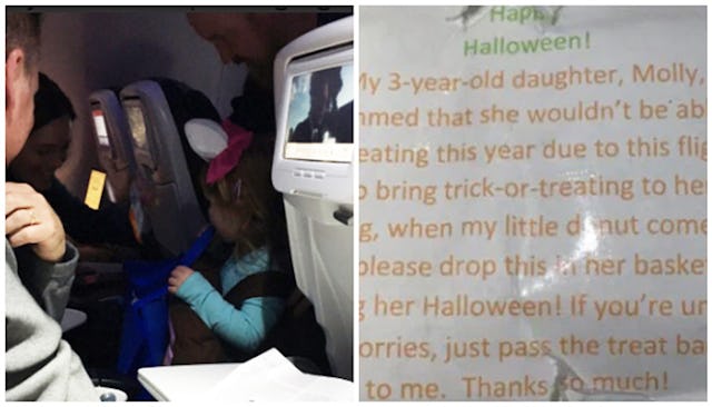 The letter dad passed around said, “My 3-year-old daughter, Molly, was bummed that she wouldn’t be able to go trick-or-treating this year due to this flight… so I decided to bring trick-or-treating to her. If you are willing, when my little donut comes down the aisle, please drop this in her bucket. You’ll be making her Halloween! If you’re unwilling, no worries, just pass the treat back to me. Thanks so much!”