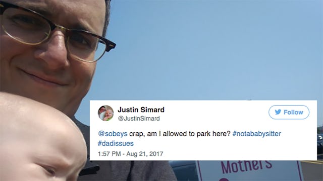 Canadian father Justin Simard was at his local supermarket on Monday when he pulled into a parking spot reserved for parents. The only problem was the sign reads “Expecting Mothers” and “Mothers with Small Children.” Simard snapped a picture of himself and his 9-month-old son in front of the sign and posted it to Twitter saying, “Crap, am I allowed to park here? #notababysitter #dadissues.” He tagged the grocery store, Sobeys in Stratford, Prince Edward Island, in the post.