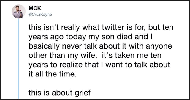 Comedian and father Michael Cruz Kayne lost his infant son ten years ago, and this week, he decided to talk about it. Fed up with experiencing people “tiptoe” around his grief and feeling isolated by it, He realized that when it comes to the loss of his son, he’s tired of having to shroud that story in secrecy and sadness. Kayne writes in a 15-part Twitter thread, how there’s more than just the tragedy of his son’s death, how there’s “a galaxy of emotions” involved and how only sharing the sad parts completely erases his son’s complex legacy.