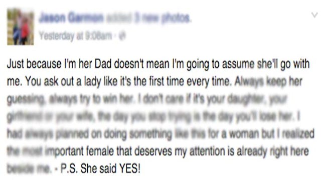 As Garmon states in his Facebook post, he didn’t assume he would be Skylar’s date, he wanted to ask her and let her say “yes” of her own accord. Knowing it’s a father-daughter dance and that he is her father, it would be easy to say “well, of course he’ll take her — he’s her father,” but that isn’t the point. You can look at this as a chivalrous act teaching Skylar how a man should treat her, or you can look at it as giving her power and agency over her own decisions. The ability to choose for herself whether her dad takes her or whether she goes to the dance at all. It’s a powerful lesson for her to learn and an important memory for her to keep as she grows and people other than her father start asking her on dates or to dances.