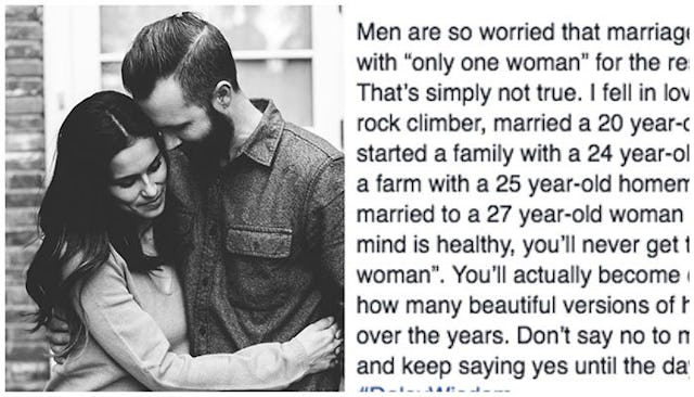 “Men are so worried that marriage will leave them with “only one woman” for the rest of their lives,” he writes. “That’s simply not true. I fell in love with a 19 year-old rock climber, married a 20 year-old animal lover, started a family with a 24 year-old mother, then built a farm with a 25 year-old homemaker, and today I’m married to a 27 year-old woman of wisdom.” Partridge wrote a non-fiction book about leadership, but clearly he missed his calling as a romance writer. Pretty sure those words are sweet enough to make Nicholas Sparks swoon.