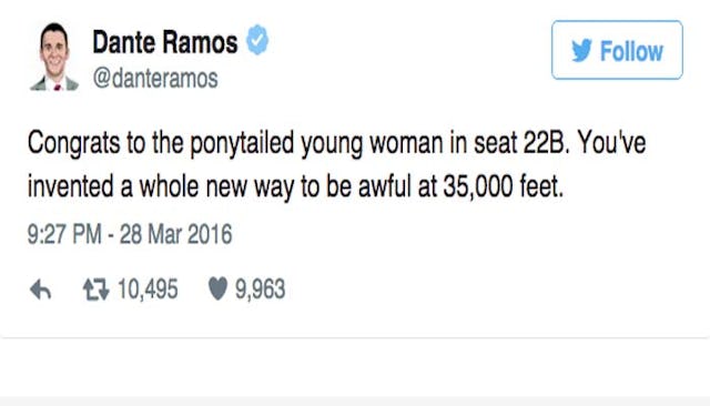 Dante Ramos, an op-ed columnist for the Boston Globe, was on a recent flight from Houston to Boston when the person sitting in front of him did something even ruder than reclining her seat. With what we can only hope was a The Little Mermaid inspired flip of the mane, a woman tossed her ponytail over the back of her seat, covering Ramos’ partner’s media screen and (we’re guessing) causing him to scan his in-flight drink closely for stray hairs.
