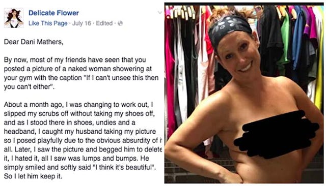 These are all well-deserved repercussions for the actions she took that day. But what about the repercussions that women everywhere — who are already having a hard time getting themselves to the gym and getting comfortable in that space — are feeling? One woman took to Facebook to personally address Mathers with an empowering photo and message. Christine Blackmon posted a very private image to her online community, Delicate Flower, to address the way Mathers violated not just one woman’s sense of privacy — but all of ours.