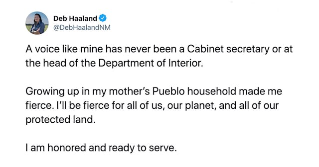 “A voice like mine has never been a Cabinet secretary or at the head of the Department of Interior,” Haaland wrote on Twitter when news of her nomination was made public. “Growing up in my mother’s Pueblo household made me fierce. I’ll be fierce for all of us, our planet, and all of our protected land. I am honored and ready to serve.”