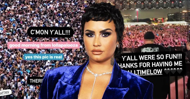 But just a week later, Lovato performed at a music festival themself. They shared a snap on their Instagram story from Anaheim, California’s Sad Summer Festival, where they joined the band All Time Low onstage for a surprise performance. In the photo Lovato shared, you can see a huge, maskless crowd. Sure, it’s not nearly the same size as the 100,000 people who attended Lollapalooza, but it’s still a stark change from what Lovato was sharing last week. Over this photo, they wrote, “Y’all were so fun!!! Thanks for having me.”