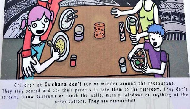 If I was handed a card like this when I walked through the doors of a restaurant, I would leave. Because I don’t want an infantilizing, passive-aggressive note shoved in my face when I’m about to give an establishment my money. I’d rather spend it somewhere else. If you’re handing a card with writing on it to the parents of small children — you’re handing it to the parents, not the small children. So at least word it as if you are speaking to an adult, and not a child. Why stop here? Why not print up cards that say, “Adults at Cuchara do not drink until they become intoxicated. They don’t speak loudly on their phones, or leave tips that are less than 20%. They are respectfull!!” How do you think that would go over?
