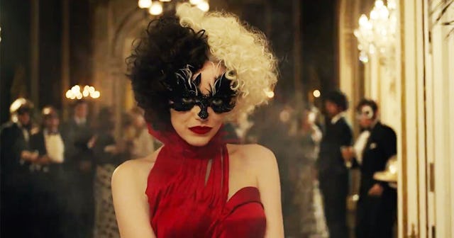 The trailer goes on to show Cruella attending some sort of ball, where she sets her cloak on fire to reveal a red dress and her signature black-and-white hair underneath, and it might be one of the most dramatic reveals ever to happen in a Disney movie — fitting for the woman who might be Disney’s most dramatic villainess.