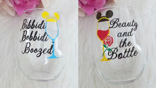 The glasses rep pretty much all the major princess, so odds are good that you’ll be able to get your fave. There’s a Cinderella glass that reads, “Bibbidi, Bobbidi, Boozed.”