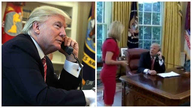 “Well we have a lot of Irish press watching this,” Trump says into the phone. “They’re just now leaving the room.” Then he calls Perry over.