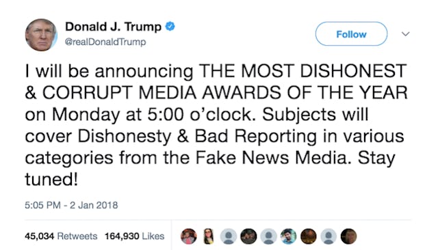 15 minutes later, Trump had moved on from stirring nuclear tensions in under 280 characters and was back at his pet subject — the “corrupt” media who are “Dishonest and Bad.” He jumps from talking about literally blowing up a country to his obsession with how the press treats him in mere minutes. Jesus Christ, how is this real life and not an episode of South Park?