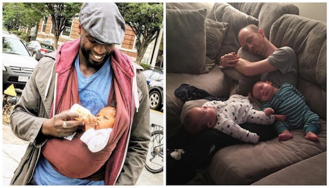 These men are pictured feeding their children, cuddling with them, playing and working out, wearing them in carriers, and basically doing what engaged parents do all the time, regardless of their gender.