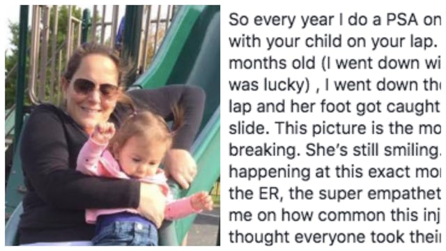 “When Meadow was 12 months old, I went down the slide with her on my lap, and her foot got caught between me and the slide,” Heather Clare wrote alongside a photo that captured the painful moment her daughter was injured. “This picture is the moment her leg was breaking. She’s still smiling… because it was happening at this exact moment,” she said. “When we went to the ER, the super empathetic doctor lectured me on how common this injury is. I had no idea,” Clare explained. “I thought everyone took their kids down the slide.”