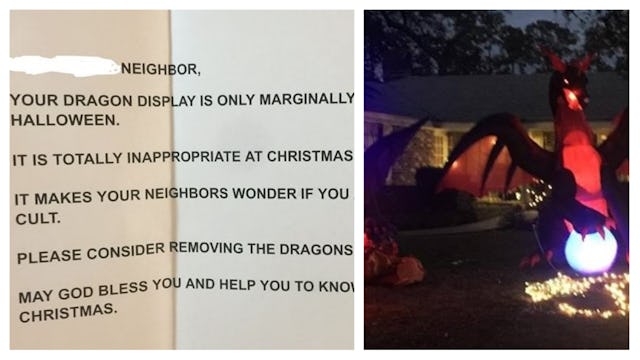 Former cop turned author Diana Rowland decided to up her holiday game by putting out not one, not two, but three life-sized dragons in her front yard to celebrate the holidays. And even though we can’t think of anything better to drive by every single morning during December, it seems not all of her neighbors agree. “Our dragon holiday display got fan mail! (And apparently the ‘true meaning of Christmas’ involves judgmental bullshit?)” Rowland wrote on Twitter after receiving an anonymous letter scolding her decorative choices.