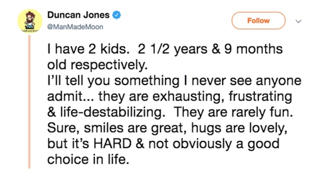Screenwriter, director, and father-of-two, Duncan Jones, caused quite the buzz on social media over the weekend because he admitted something most parents have thought at one time or another — parenting is really freaking hard and not always enjoyable.