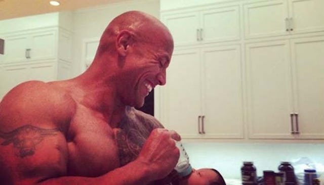 As if an image of Dwayne “The Rock” Johnson bottle-feeding his tiny two month old daughter Jasmine wasn’t cute enough, enter his adorable bulldog… to almost make it unbearable.