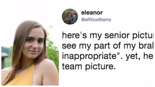 Eleanor Fitzwilliams, a senior in high school who was recently told her senior picture was “inappropriate” by school officials, summed up the entire situation in one perfect tweet.