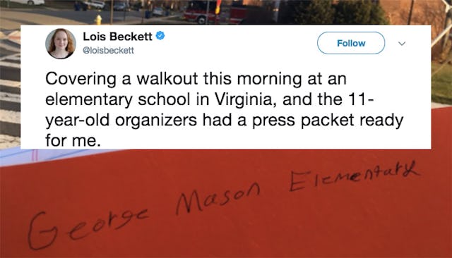 Lois Beckett, a reporter for The Guardian, not only interviewed Wadler and Anderson, she attended their walkout and documented the event on Twitter. She shared that the students were more than prepared — they even had a “press packet” ready for her when she arrived.