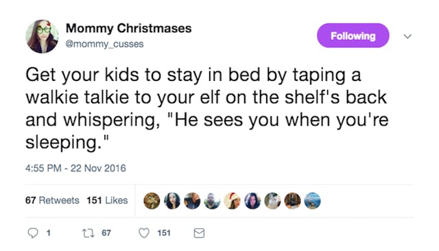 Modern parenthood has been besieged by a holiday phenomenon known as Elf on the Shelf. To know him is to hate him. He’s here to watch your kids and report any bad behavior back to Santa, but he’s also here to low-key ruin your life for a month, because coming up with fun and creative ways for him to pop up every morning during what’s arguably the most stressful month of the year is now a parental expectation. So let these funny tweets turn your tears of Elf terror into tears of laughter. Because that (and alcohol) is our only hope of surviving this shit.