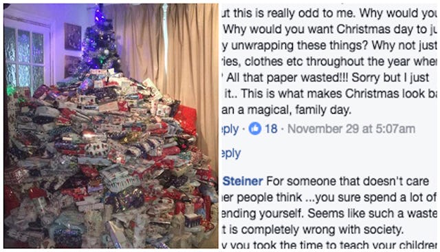 Everyone does holidays their own way. There’s no instruction manual on parenting, nothing that tells us giving our children more than a certain number of gifts is harmful. As long as Tapping feels her kids appreciate their Christmas morning unwrapping marathon, and she’s cool with keeping that many toys organized, then more power to her.