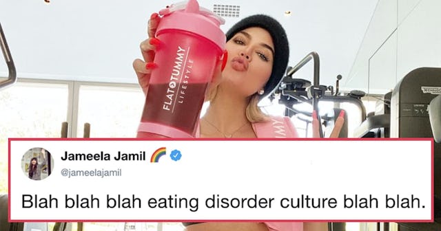 Jamil shared Kardashian’s post, which features a photo of the latter holding a Flat Tummy Co. shake in the gym and touting, “THESE SHAKES WORK.” Jamil’s caption pretty much said it all, though: “Blah blah blah eating disorder culture blah blah.” The Good Place star shared the exchange on Instagram as well, writing, “IS SHE POOR?”