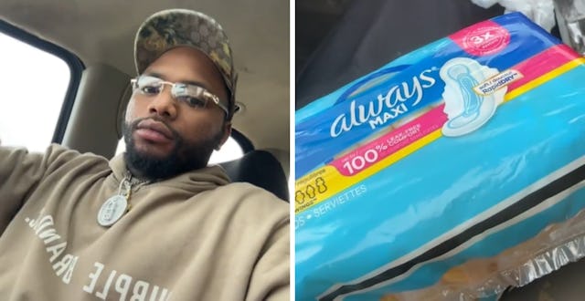 He then flips the camera to show what he bought, explaining, “I got her some Always pads, and I got her some wings, but I didn’t know that’s not what she meant. She meant just the pads that had the wings. The [pads] got the wings, and she got some more wings.....yup, I f—cked up; it’s all good.”
