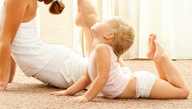 My daughter is not against exercise per se, to judge by her constant state of movement, aka her waking life. She’s against me, and to a lesser extent, her father, exercising. And I’m not including here endless rounds of “Ring Around the Rosy” (Why don’t two-year-olds get dizzy?). Or performing extra vehement renditions of “Wheels on the Bus” to engage your obliques. I’m talking about weights, lunges, and all those variations on plank that are supposed to tighten the core muscles and get me back into those jeans I could barely zip all the way up before I got pregnant.