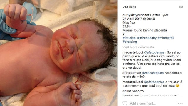 As it turned out, the IUD had just migrated up into Hellein’s uterus, and was still there behind the placenta. When her baby boy, Dexter, was born via C-section, the doctor recovered the wandering Mirena, too. For her birth announcement, Hellein hilariously stuck the IUD in Dexter’s hand and snapped a photo, which she hashtagged “#mirenafail.”