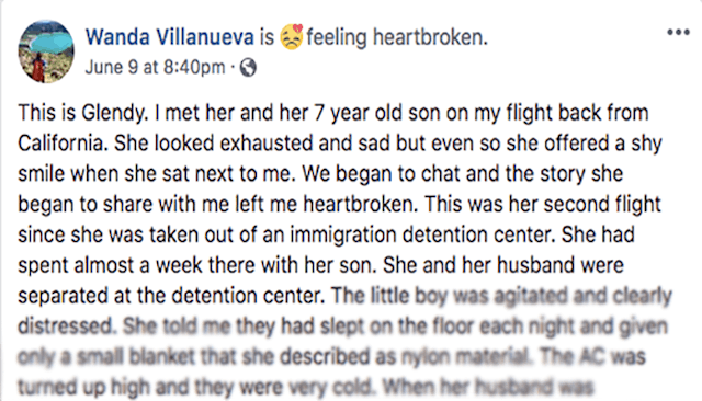 On Friday night, Wanda Villanueva was headed home to North Carolina from California when she started chatting with the tired, shy mom seated next to her. As the woman, Glendy, told her story, Villanueva was shocked by what she heard: a tale of horror about how the young mom and her family were treated at an immigrant detention center.