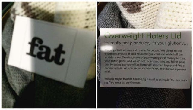Oh, sure — there’s not enough awful stuff happening in the world. Why not just travel around making people like utter shit? London Transport police have urged people to come forward if they see anyone handing out the cards. There’s been no confirmation regarding who is involved, but inclusion of the images on a site called Slimgur, which describes itself as “the internet’s premier shitlord image host” has led several sources to speculate. The Guardian explains”Shitlord is internet slang originating from the website Reddit to describe online activists who oppose acceptance of people who are overweight.” It may be the work of people formerly associated with fat-shaming sub-forums that were banned on Reddit after the site’s Chief Executive Ellen Pao tried to get a handle on harassment by cleaning up the site and ridding it of such forums. There will always be miserable jerks out there, unfortunately. But there are also things like this: