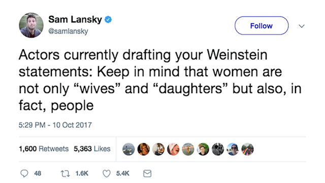 Let’s recap some of the allegations, shall we? There was the audio of a woman begging Weinstein to leave her alone, as he used guilt and manipulation to try to get her in his hotel room to watch him shower. Then there was the story of the journalist who was cornered by Weinstein in a restaurant kitchen, and when she refused to let him touch her he demanded she just “shut up and stand there” while he masturbated and ejaculated into a plant. Then there was the New Yorker article detailing the several women who claimed Weinstein forced them to receive or perform oral sex — and several who claim he raped them.