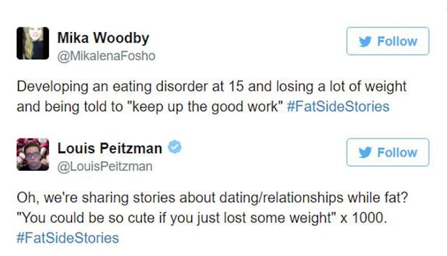 Using the phrase #FatSideStories, men and women have been sharing the things that only people who carry more weight than others endure. Thanks predominantly to the actions of others, there is a bunch of shit people who others deem “overweight” are constantly up against.