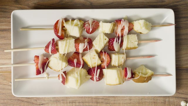 Yes, I need pound cake in my life. Anyone who says they don’t is lying. Period. It’s fluffy, light vanilla-y taste takes me to a happy place. I’m even happier when said pound cake is from the store and I didn’t need to use the oven and heat up the house in July to make it happen. This summer, I’m all about these easy, no-bake strawberry shortcake skewers. I mean, the fruit cancels out any excess butter, right? It’s a known fact, people. And eating things off sticks takes longer, so you might even be able to share some skewers with the rest of the fam. If they hurry. Either way, enjoy!